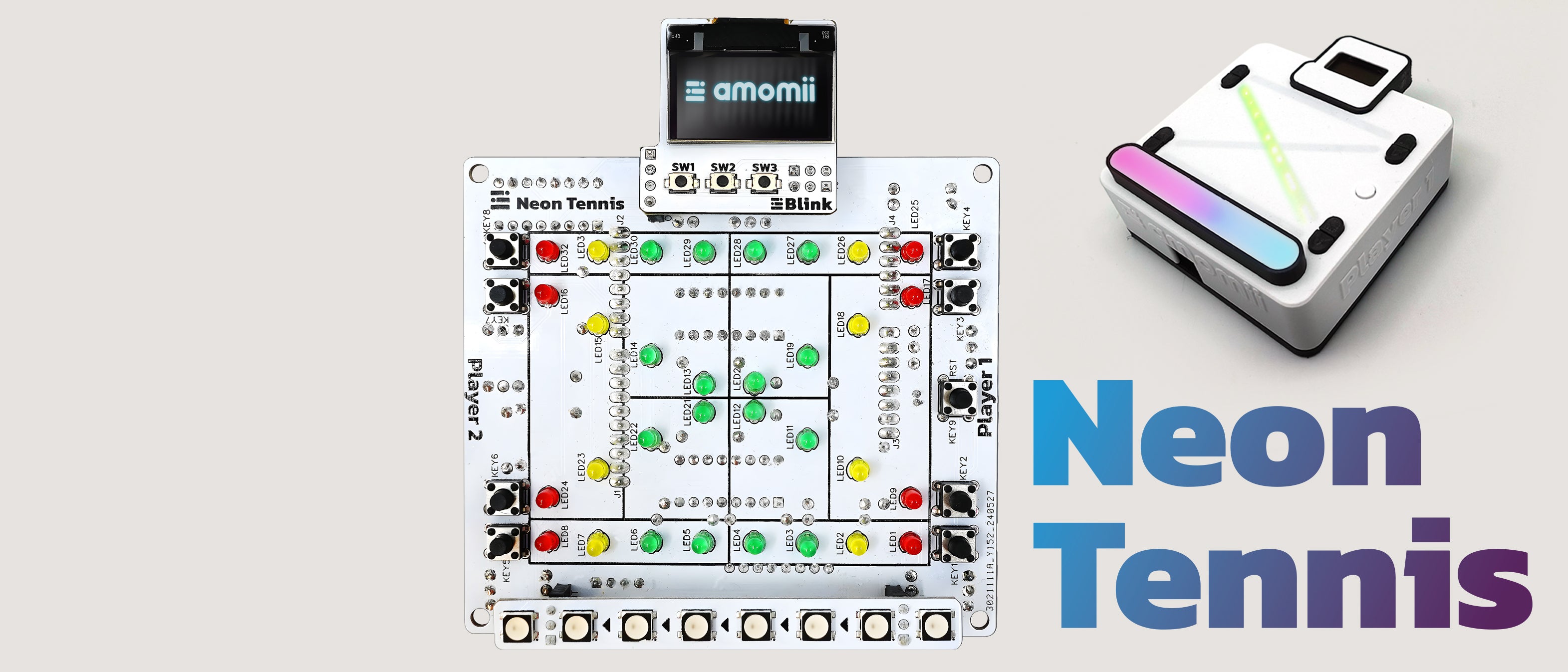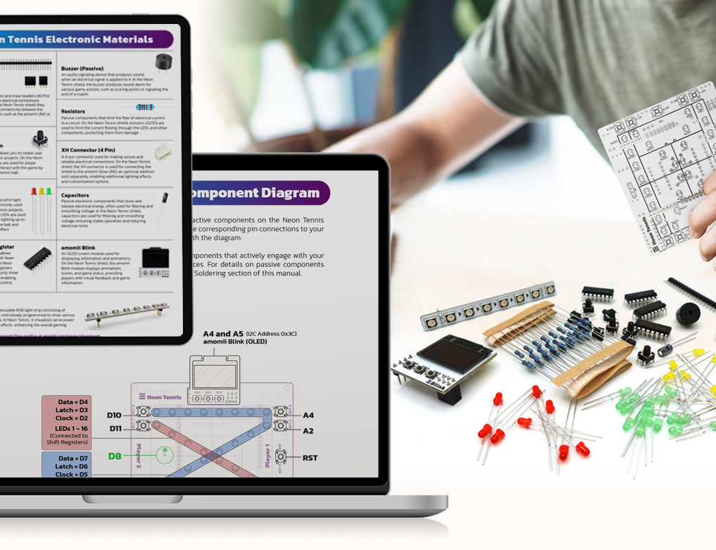 The amomii Blink not only enhances your Neon Tennis game but can also be used as a standalone mini shield. It features three built-in push-buttons and can be directly connected to an Arduino UNO. Displaying scores, animations, or data, it’s a flexible, high-quality display for a range of projects.